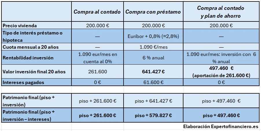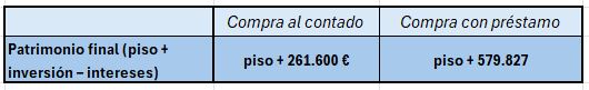 - Compra financiada con préstamo o pignorando ahorros, manteniendo la inversión durante 20 años: Tendremos el piso y 579.827 euros descontados ya los intereses pagados por el préstamo.