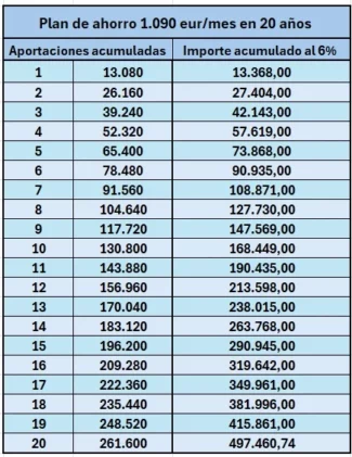 En la tabla anterior vemos la evolución de este plan de ahorro de 1.090 euros al mes durante 20 años al 6%. Si la rentabilidad media anual final es del 5% el un importe total acumulado en esos 20 años sería de unos 431.000 euros.